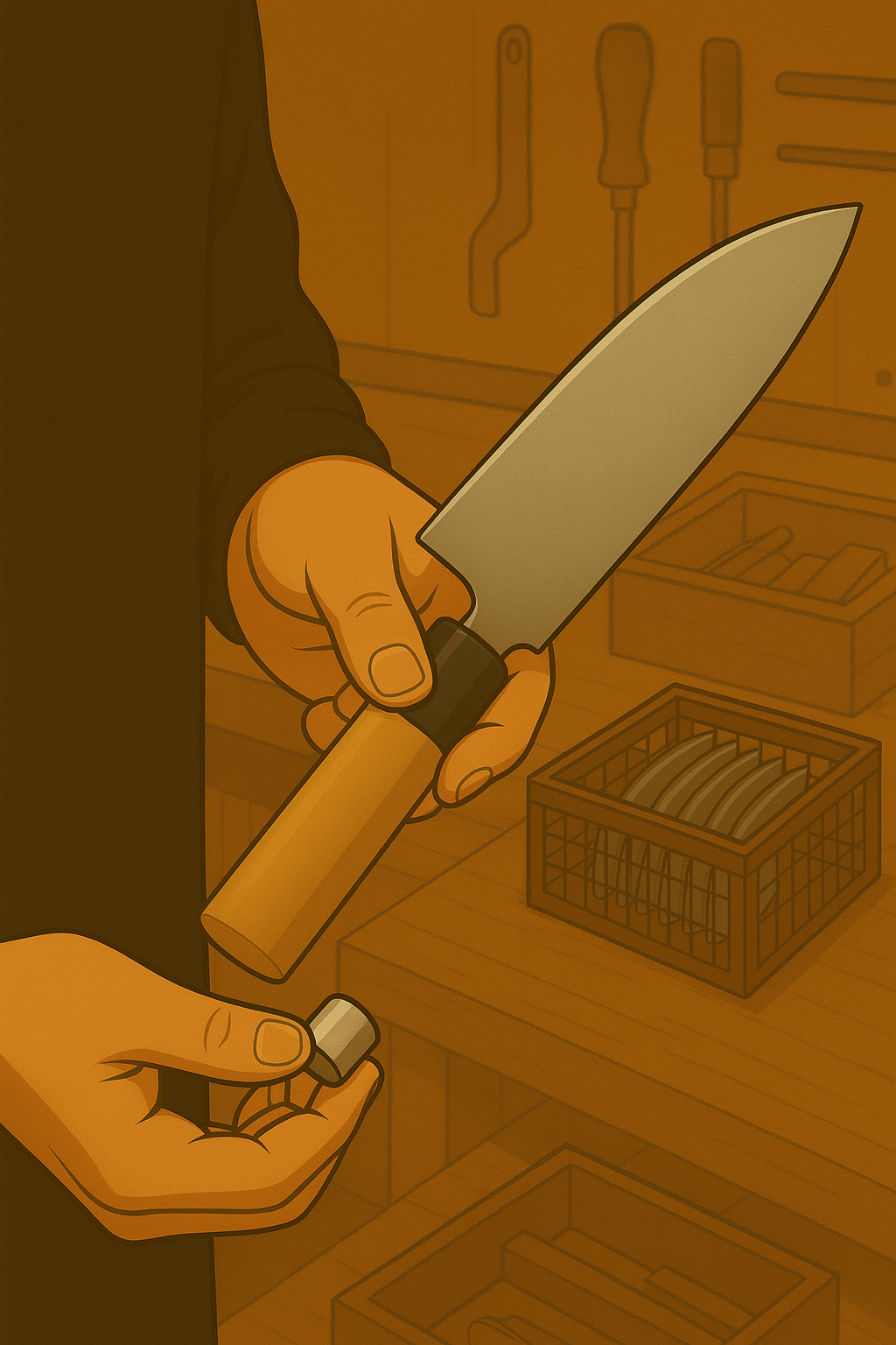 Le manche est ensuite assemblé à la main avec la lame, dans le respect des tolérances les plus strictes, garantissant solidité et alignement parfait.