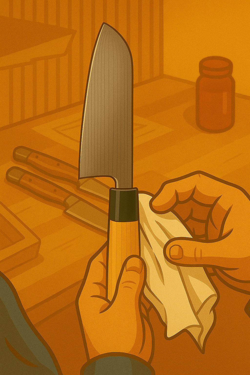 Pour d'autres modèles, la lame est soigneusement polie miroir, à l’aide de disques de coton et de pâtes abrasives ultra-fines, jusqu’à obtenir une surface parfaitement lisse et brillante qui sublime les motifs damassés et facilite le nettoyage.