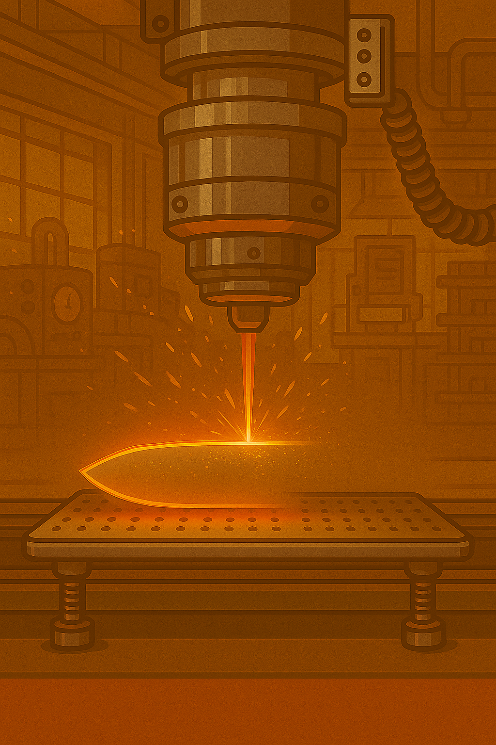 La lame est créée par impression 3D métallique, couche après couche, à partir de poudre d’acier, fusionnées entre elles grâce à un puissant laser capable de chauffer une zone de quelques millimètres à plus de 1300 °C. Ce procédé garantit une structure homogène, sans défaut interne.