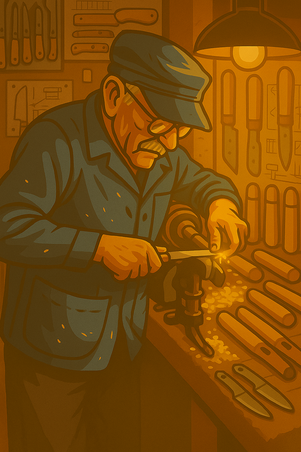 Enfin, chaque lame est affûtée manuellement sur pierre rotative, selon un angle adapté à son usage, pour offrir un tranchant rasoir dès la première utilisation.